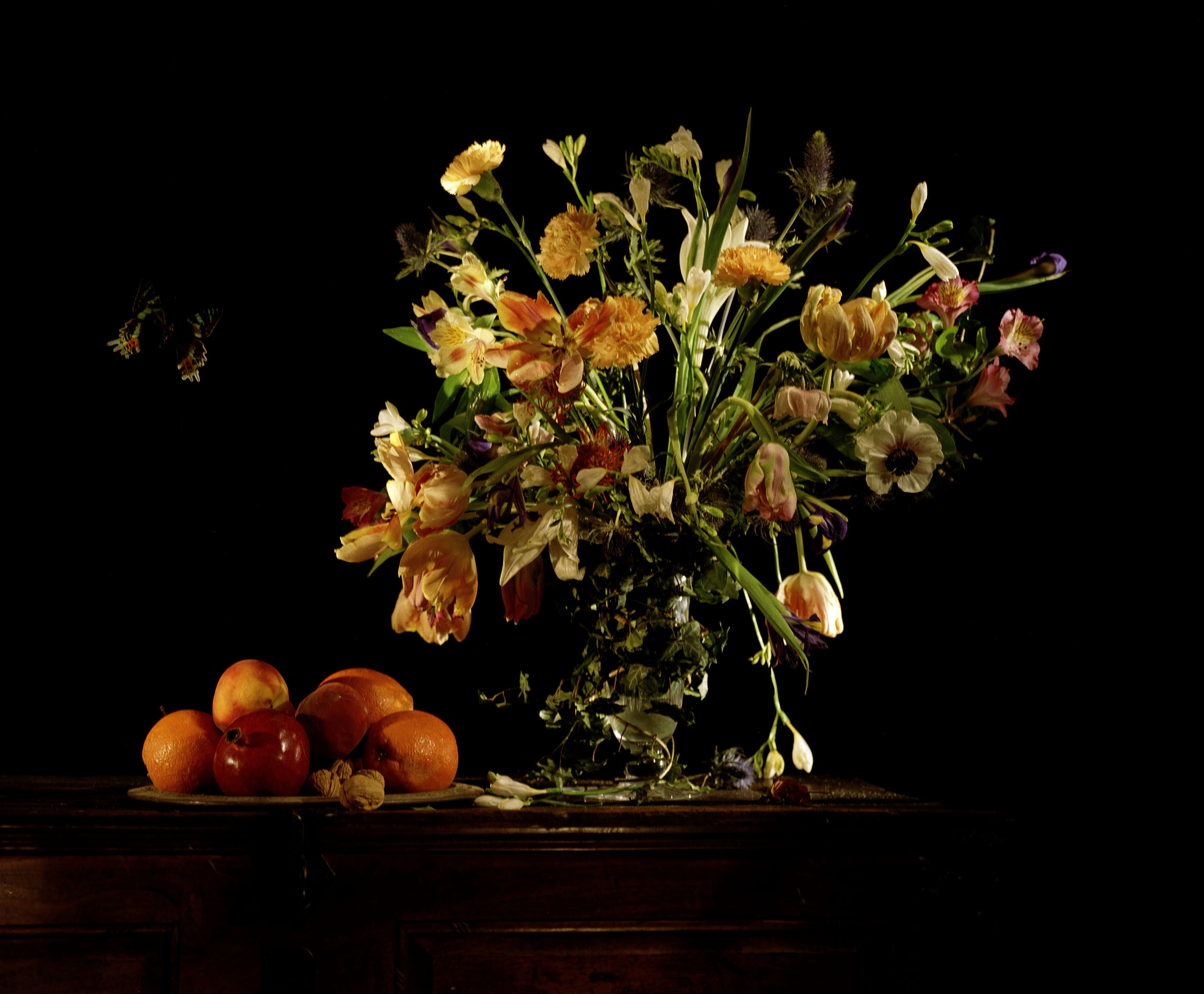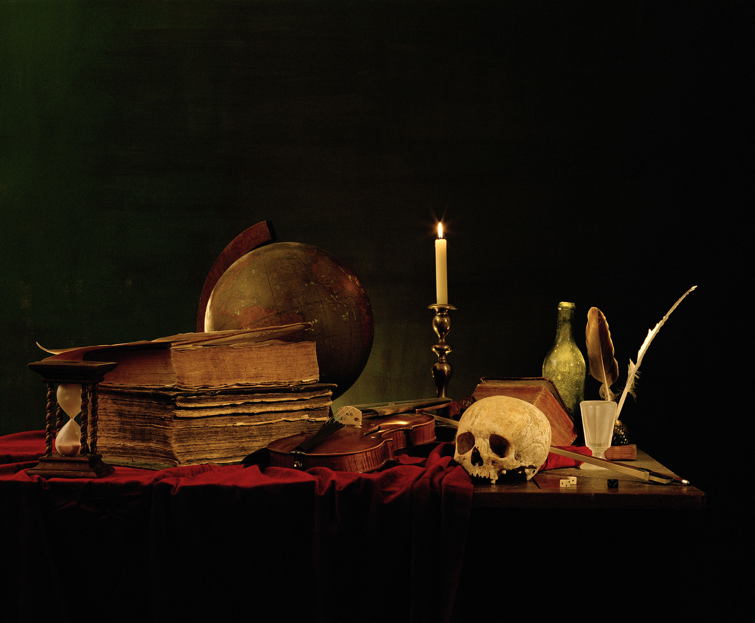 To the viewer observing the Vivace series, the treatment in the style of the old masters of the motifs, their visual attraction and sophisticated lighting generate at first the illusion of standing in front of three Dutch still lifes: beautiful and noble objects are presented, which symbolise wealth, luxury and scholarliness. However, by virtue of their life cycle, according to baroque understanding, flowers and candles refer to death, books and the violin to the perils of scientific and artist hauteur, the silverware and grapes to sins such as pomposity, intoxication and gluttony. Finally, skulls and hourglasses underpin the reference to the transience and conceitedness of all earthly existence. Yet – contrary to the historical paragons – Pia Maria Martin’s objects develop an almost eerie life of their own: indeed, the decomposition, for example, in the withering of the flowers is still present, as if by magic the violin suddenly starts to play, the lobster begins to pare a lemon, a snail starts to creep over the fruit. Instead of the symbolic content, it is the representative force of the (moving) picture that comes to the fore. Life as a whimsical play appears within the tense relationship between the reference to the vanitas and the (animated) portrayal of reality, whose motives and goals remain, however, impalpable.